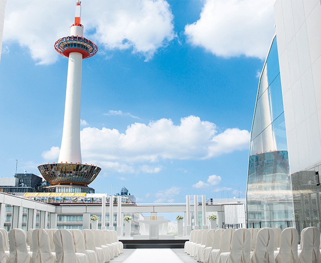 ホテル館内の神殿「稲寿殿」では、伏見稲荷大社より授かった神様の御前において、大社の神職・神楽女・楽人のもと厳かな挙式が執り行えます。また、世界文化遺産にも登録されている上賀茂神社をはじめとした、京都に数多くある名高い寺社仏閣での挙式をトータルサポートすることも可能です。 -